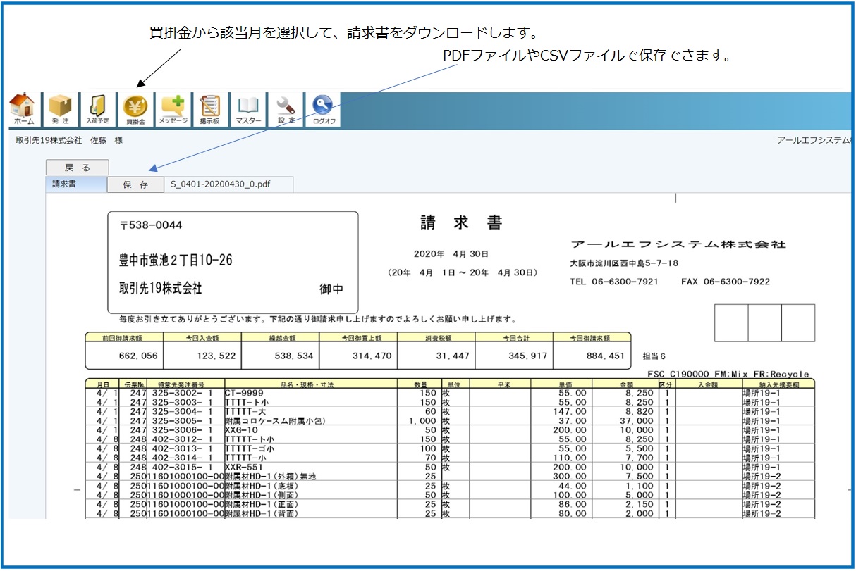ダウンロードした納品書や請求書は、印刷や保管に便利なPDFで作成されています。また、必要に応じてCSVファイルでもダウンロードできますので、