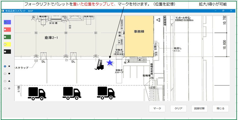 完成した商品の置場を工場の配置図上にマップ(印を付ける)することにより、出荷時に商品を探す手間を圧倒的に低減します。